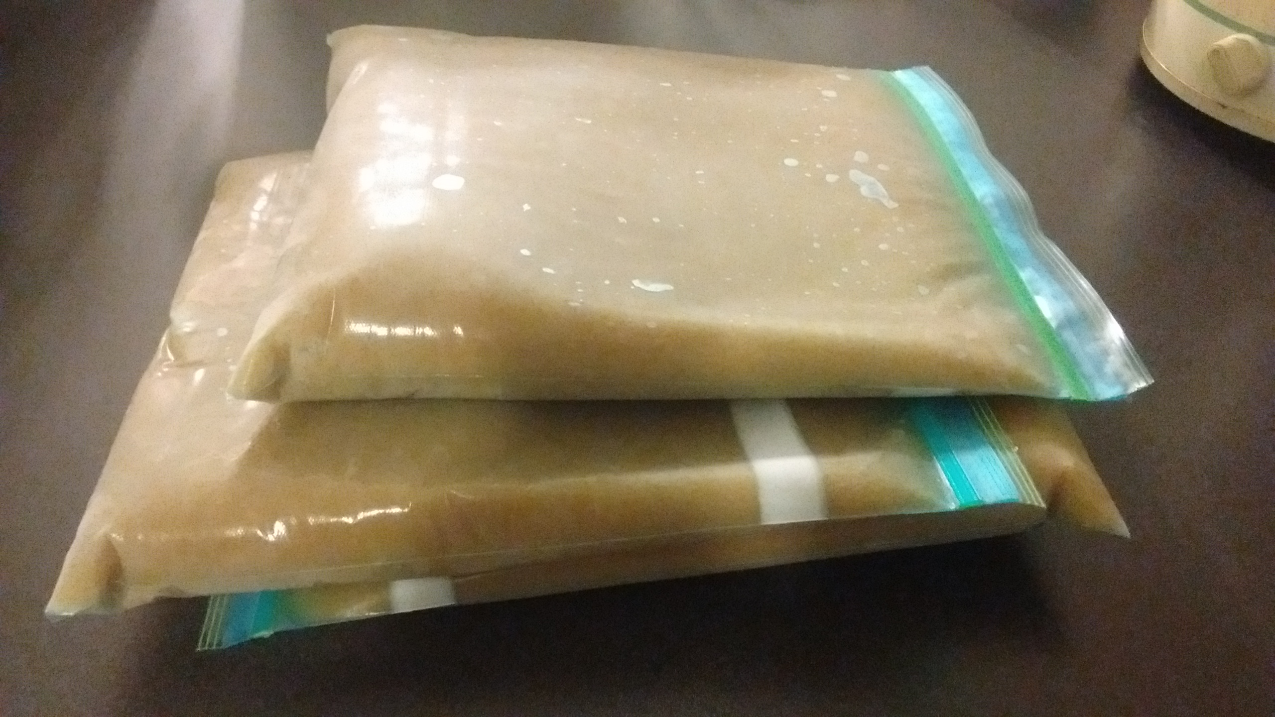 Once the apples are tender, transfer small batches to a food processor and blend to desired consistency. I allow the applesauce to cool to room temperature in a large metal bowl before transferring it to gallon-sized freezer bags. Enough applesauce is ladled into the bag so that it is about a half inch thick when sealed and laying on its side. Full bags stack nicely in the freezer.