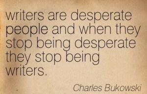 Last Friday’s post included a quotation from Charles Bukowski stating “Writers are desperate people, and when they stop being desperate, they stop being writers.” This particular quote fit my writing life so well. At any given moment of the day, I have felt desperate about my writing. Desperate to complete it, desperate to come up with new things to write for my blog or a literary journal or a novel, desperate to be published, desperate, desperate, desperate. All that desperation added up to a lot of miserable living.