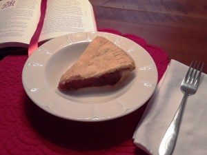 I included cherry pie in my novel, The Tedescos, because it’s been a favorite since childhood. As delicious as sweet cherry pie is, there is just something—how can I describe it—more old-fashioned tasting about a sour cherry pie. The inclusion of rhubarb, traditionally featured alone or in combination with strawberries, makes Shirley’s pie a titch more special. Then there is the addition of a few ingredients even Claudia can’t discern.