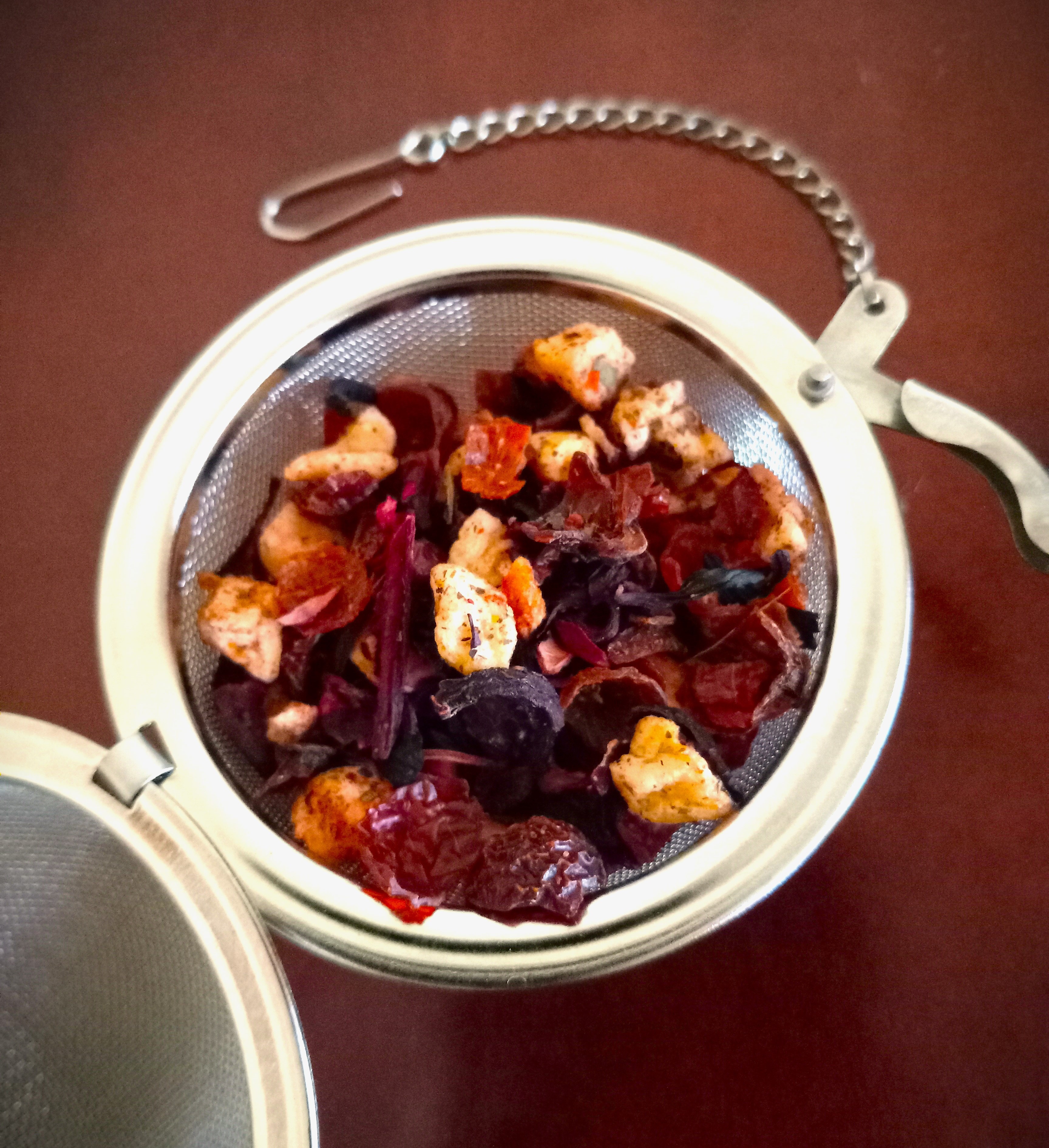 Wild Strawberry, from Ohio Tea Co., is luscious with rosehips, hibiscus, apple pieces, strawberry pieces, and raspberry leaves. It’s perfect for icing. As a tea enthusiast, I insist that my teatail recipes highlight the tea, as all tea cocktails should, instead of boozing up the drink resulting in a beverage top-heavy in alcohol(s) wherein the tea is reduced to nothing but a color.