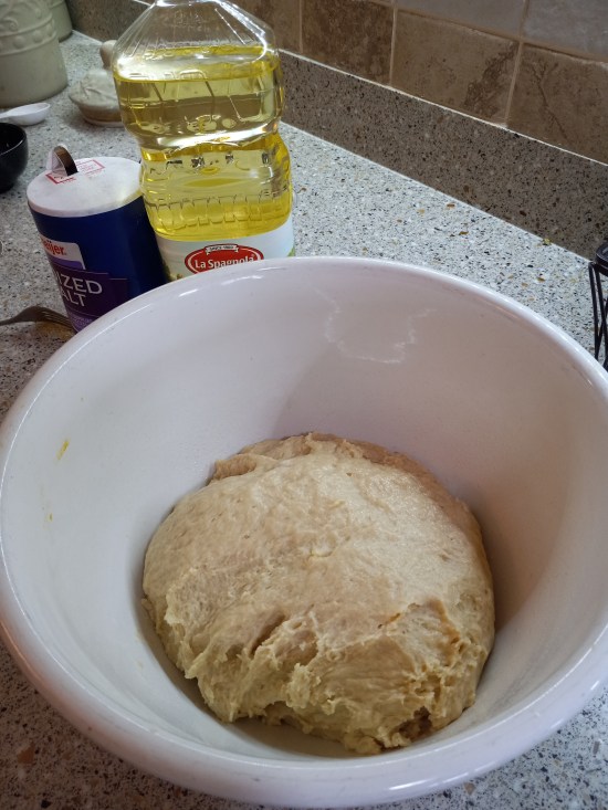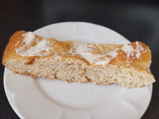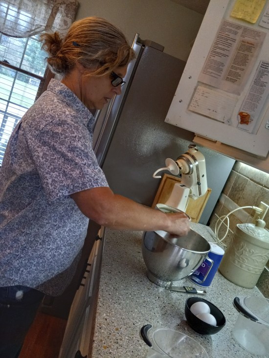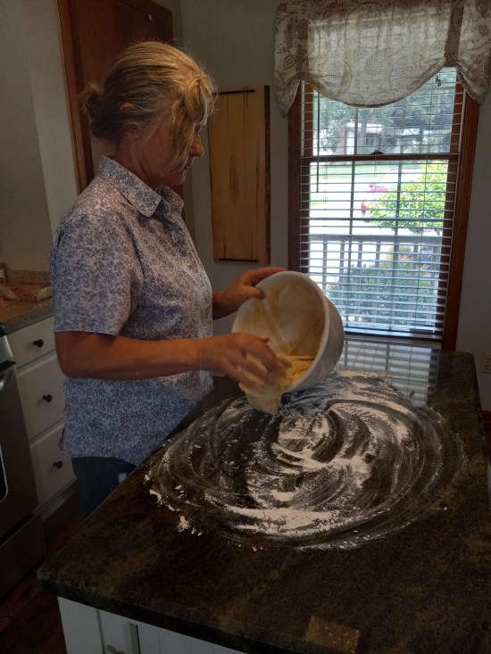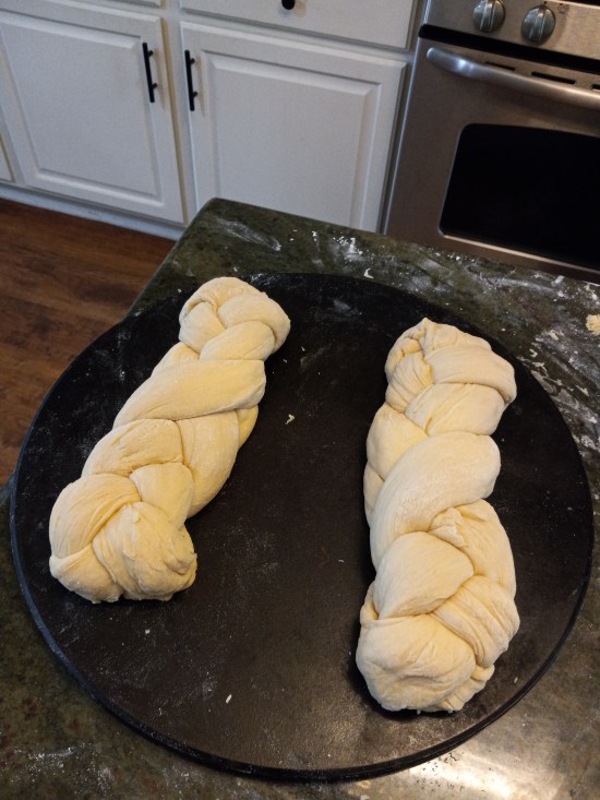 When I mentioned my bread baking goal to a friend, Robin Luton, she asked if I’d ever made challah. I replied that I had observed the process once, so Robin graciously invited me to her home to learn how to make it for myself. I had a lovely time and learned a simple yet elegant technique to braid the three strands of dough resulting in a beautiful loaf of challah. As expected, Robin’s loaf was prettier than mine because she’s an expert at it, and I’m a beginner who made one strand fatter than the other two. Still, my loaf was tasty. Enjoy the pictures of our efforts and click the link for Robin’s Challah.