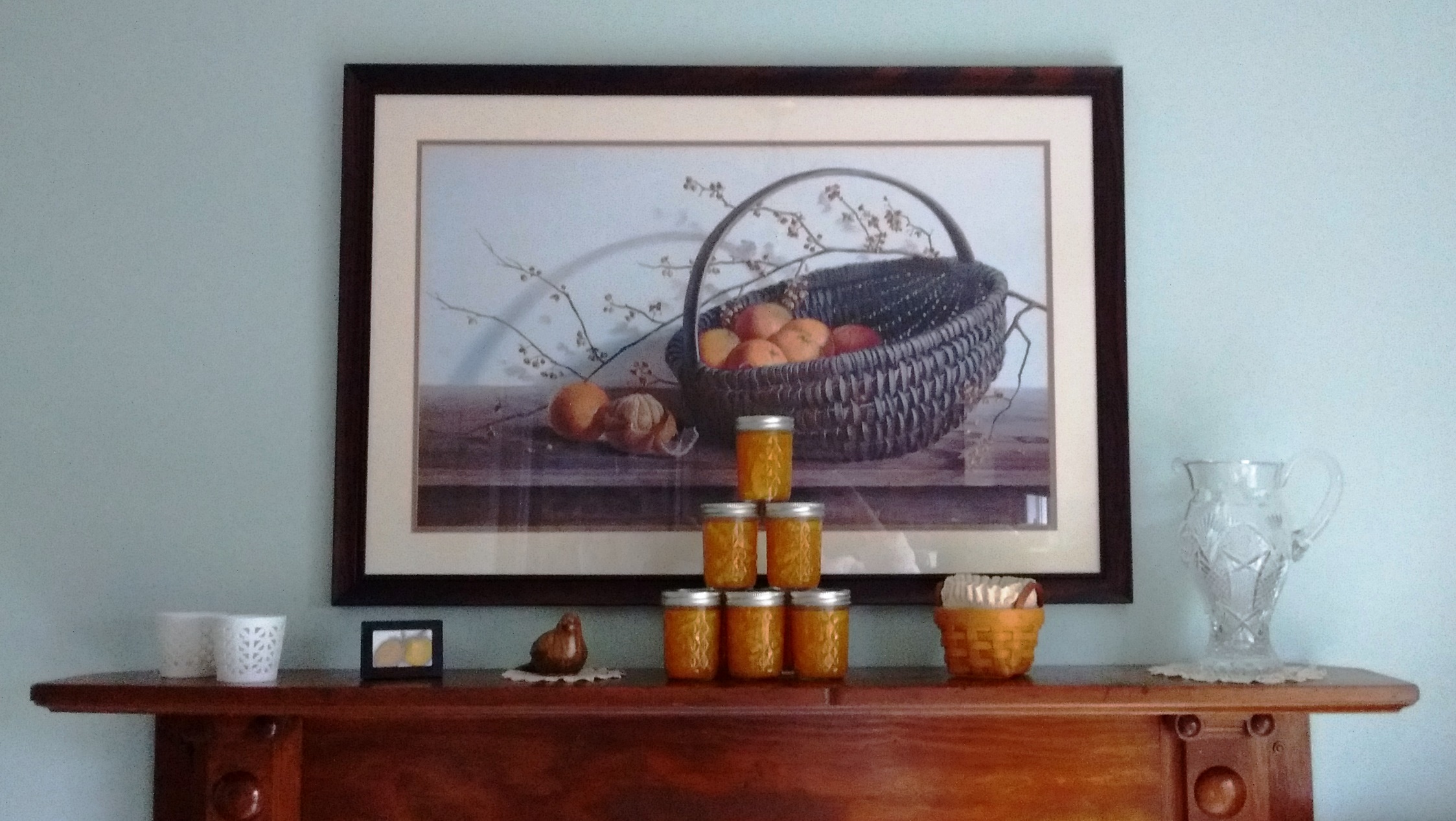 From Chapter One, I featured fried eggs and potatoes, ham and redeye gravy, buttermilk biscuits with butter and jelly, creamed peas, fried apples, and canned peaches for the breakfast celebrating my protagonist’s birth.