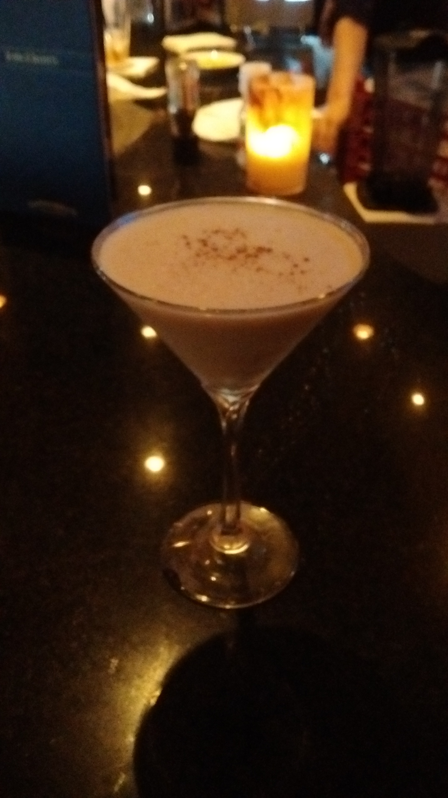 Emily and I requested Tanqueray gin, and the lovely bartender, Gretchen, was kind enough to procure heavy cream from the kitchen to make our drink. The restaurant where we dined makes a Brandy Alexander with gelato, but we were striving for authenticity. In our opinion, the drink was delicious. Not too cloying, the flavor of each ingredient blended well, but they also remained well defined. The gin made for a light, crisp drink despite the cream. For the sake of research, we tried the brandy version.