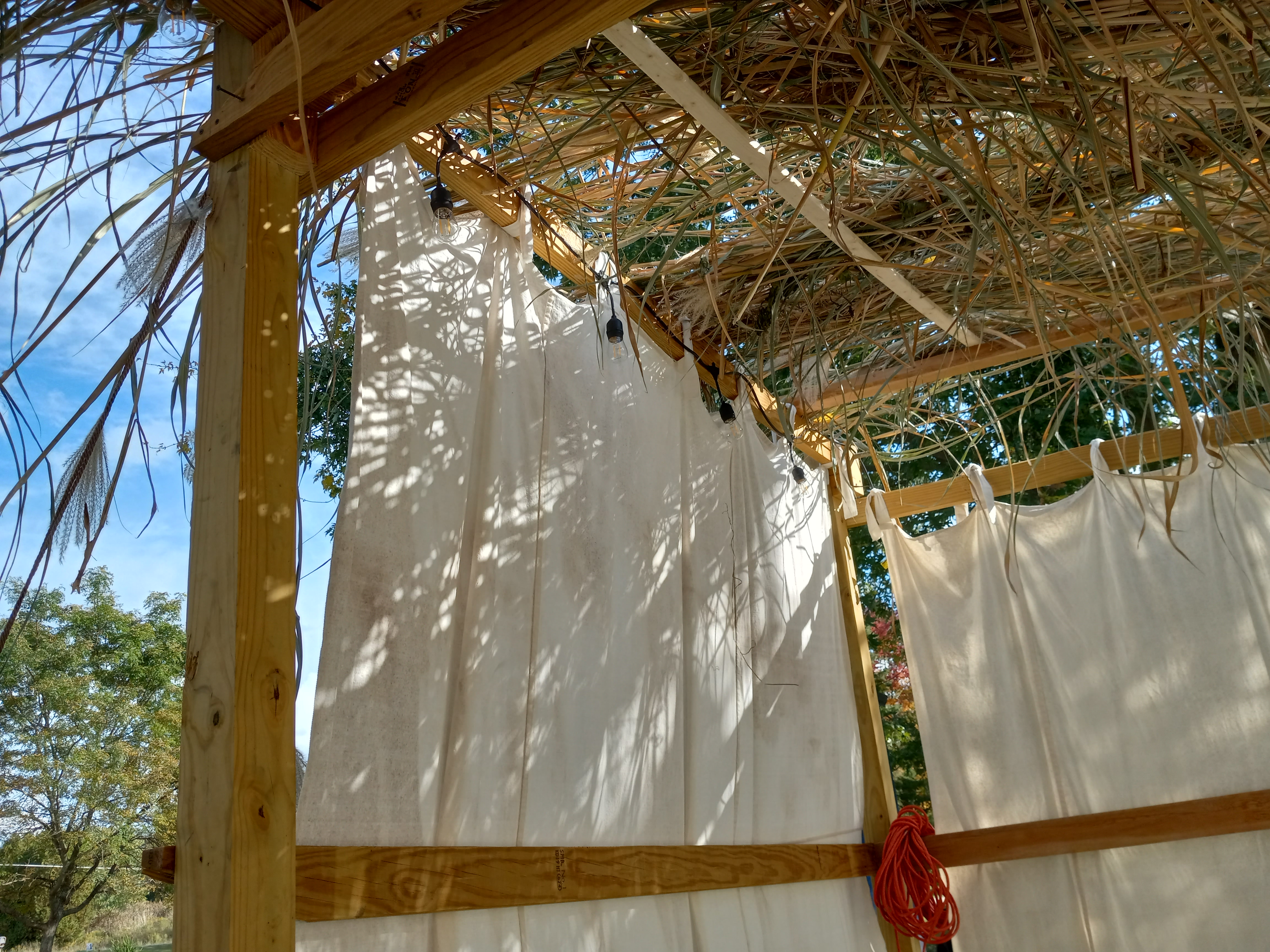 I really like this frame because our son, Joshua, designed it. It’s very sturdy, and still the designer in him wants to create something more substantial. He asked if he could dig postholes, fill them with concrete, and add forms that would secure posts in place. I gently reminded him that his idea would be permanent, and one of the points of Sukkot was to remind ourselves of the temporary nature of this portion of our life. He nodded in agreement and went on to design a sturdier frame under the requirements that it must be able to be dismantled and transported not unlike the original sukkahs Israel used.