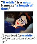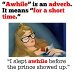 Take today’s The Weight of Words for example: a while versus awhile. My favorite grammar sources agree with what I’m about to present, however, there are a couple that disagree. I’m siding with the majority on this one because one has to draw the line somewhere, and in most cases, rules really are for the writer’s benefit.