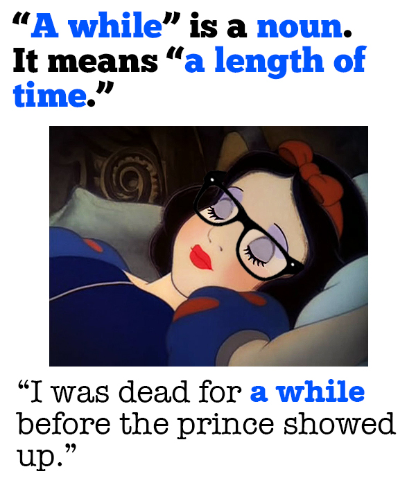 When describing a time, which is a noun, use a while. How do you know it’s a noun? The article a before while is the tip off. Also, if you can replace a while with another article/noun combination such as a week, then you should be using the two-word combo of a and while.