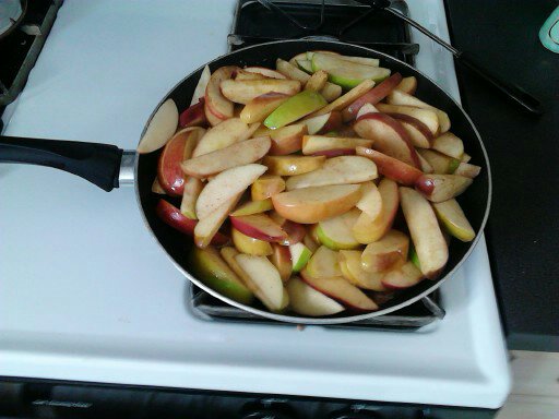 Slice each unpeeled apple in eight pieces and place in a large mixing bowl. Toss the apples with approximately a ¼ cup of brown sugar, several hearty shakes of cinnamon, and salt if using. Heat at least half a stick of butter in a very large skillet because this is one of those recipes that seem to grow as you make it. More butter means more syrup.