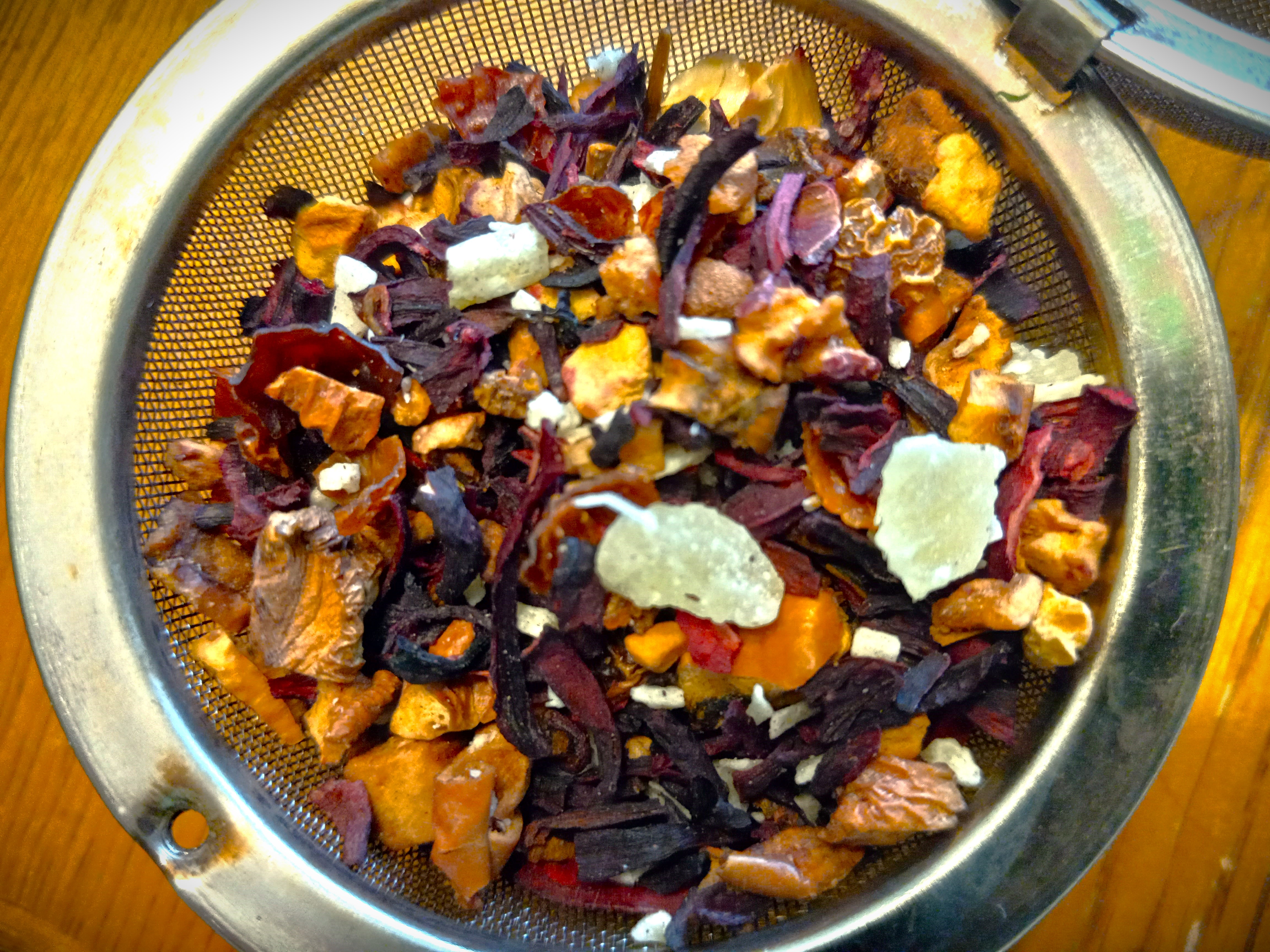 About two years ago, I purchased a two-ounce packet of Hawaiian Colada Rooibos from Ohio Tea Co. during a sidewalk sale at their establishment. The sweet earthiness of the rooibos blended perfectly with the other ingredients and lent itself quite well to the teatail I had in mind. Although we could never settle on a name for our teatail, we enjoyed it thoroughly and frequently that summer. But alas, Hawaiian Colada Rooibos was a limited edition and is no more. Imagine our heartbreak.